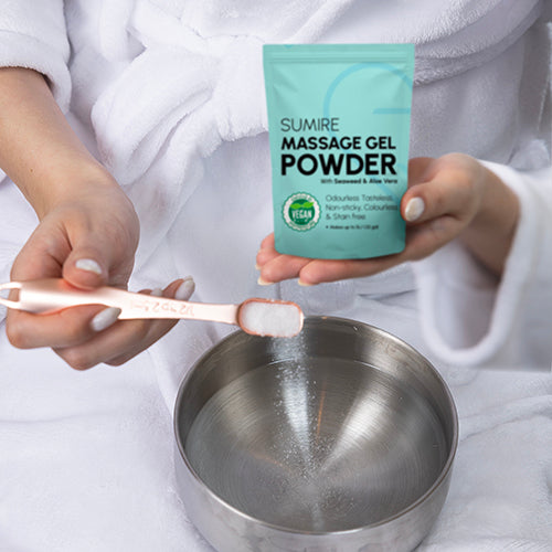 Our Sumire Massage Gel Powder now comes in resealable sachets for enhanced sustainability and convenience. Made with vegan ingredients and is free from Parabens and Glycerin, ensuring you enjoy a safe and nourishing massage experience that is kind to both your skin and the environment.